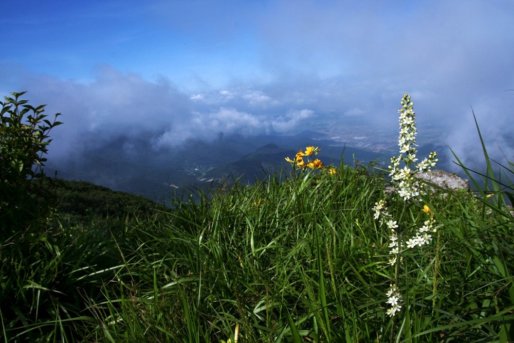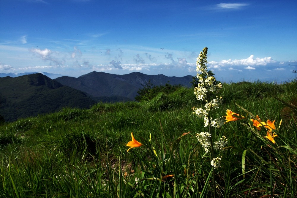 파란하늘에 원추리와 흰여로 환상적인 만남입니다.