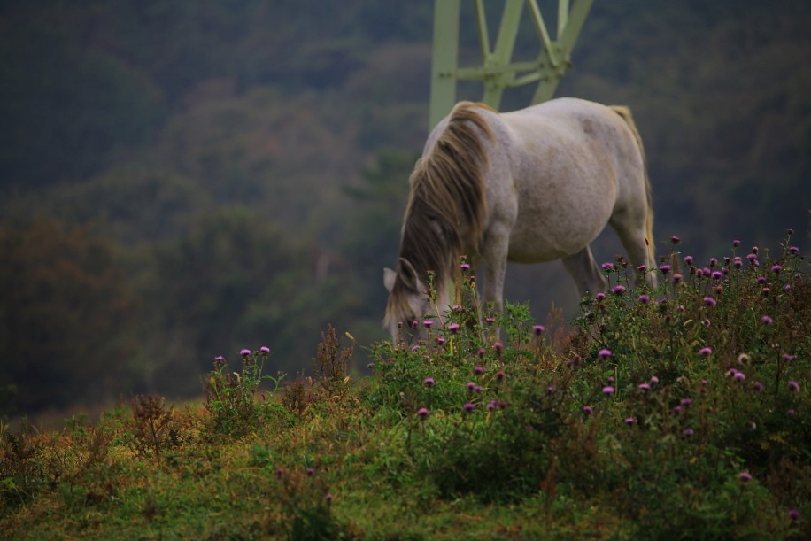 한가로이 풀을 뜯는 말과 함께 가시엉겅퀴의 가을서정이 풍성합니다