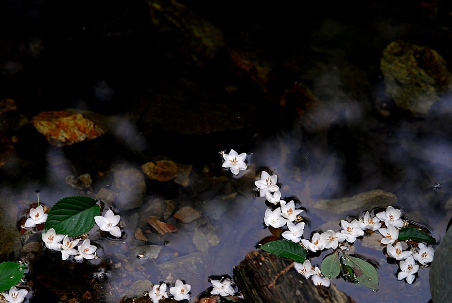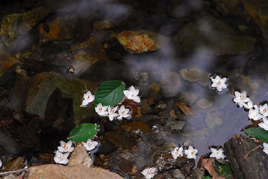개울에 떨어진 낙화가 멋스럽습니다.