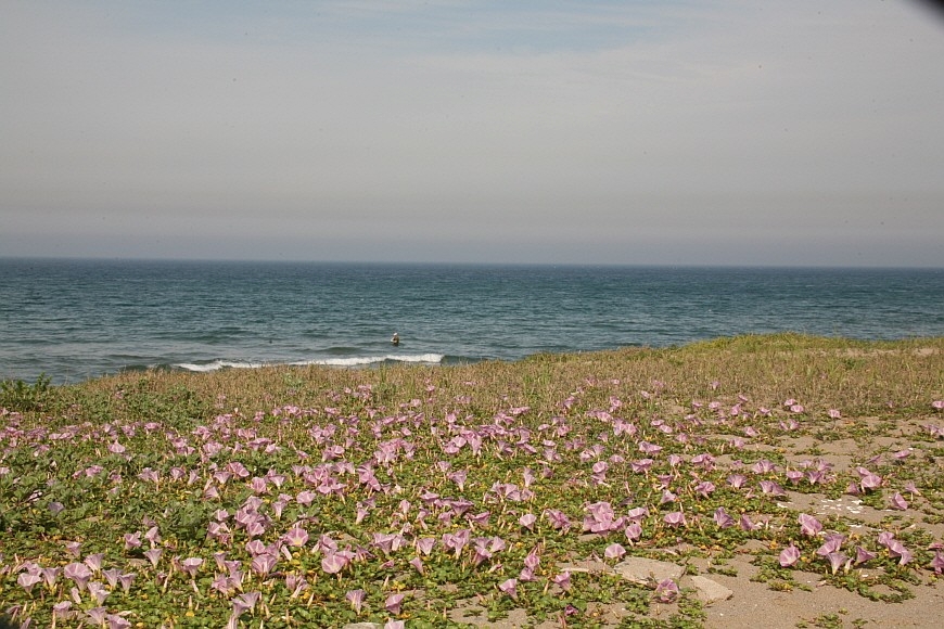 갯메꽃과 바다가 서로 기싸움하며 대치하고 있는 것 같아요.