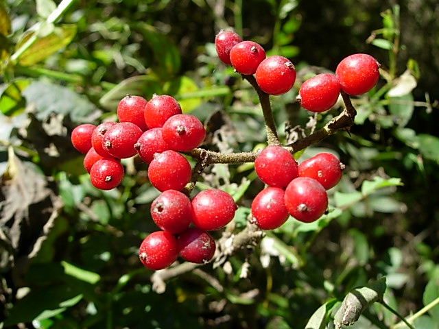 혹시 다른 개체일지도 모르겠군요. 덤불속에서 윗그림의 열매맺힌 가지를 감싸고 낯모르는 덩굴이 함께 엉겨 있어서 밑동을 중심으로 잔가지쪽으로 추적해서 아랫그림의 잎을 옮겨왔거든요.