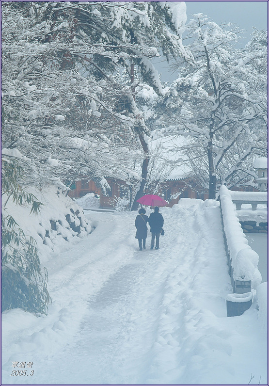 눈길에 어눌한 걸음걸이... 빨간 눈우산... 연인 아닌듯한 해묵은 부부... 마음껏 눈쌓인 낙락장송의 정경.