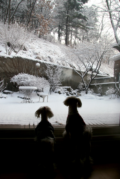 마당에 풀어주시지 그랬어요? 쟤네들 나가서 눈위에 뛰어댕기고 싶어하는 눈친데요.