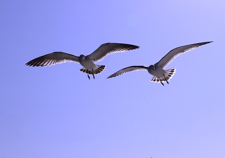 코발트빛 하늘에 부부갈매기의 비행 멋지다