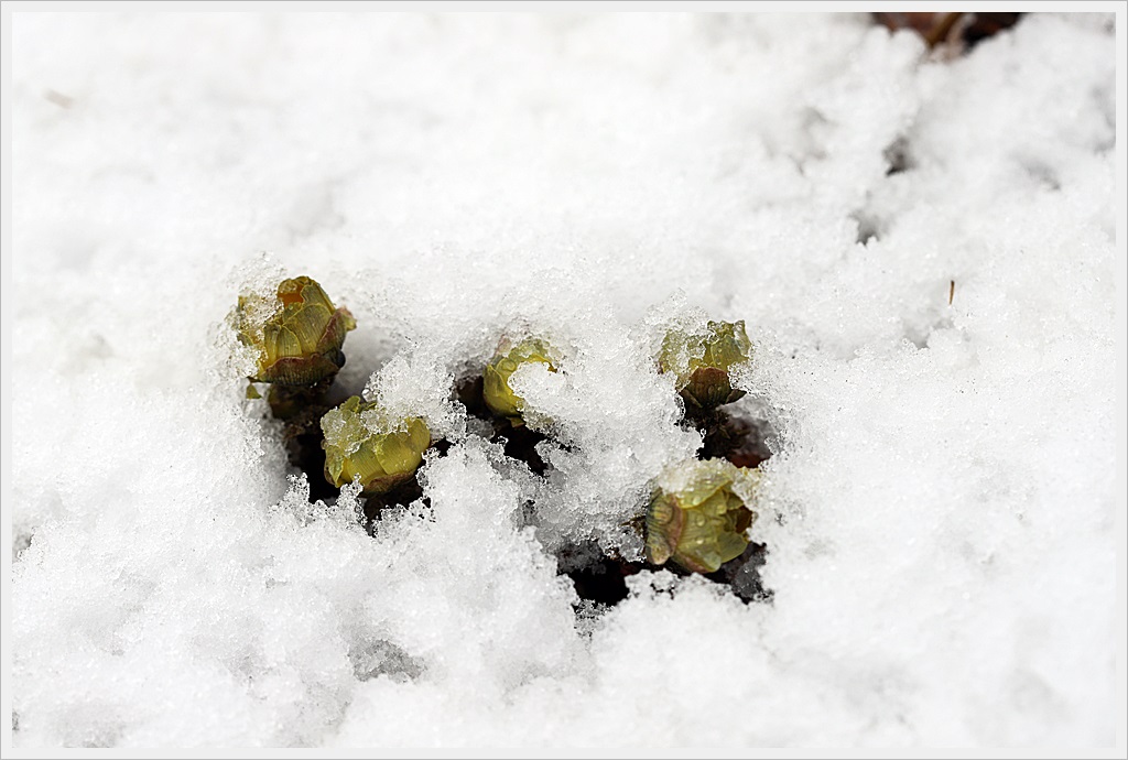 깜짝 폭설에 놀란 개복수초.